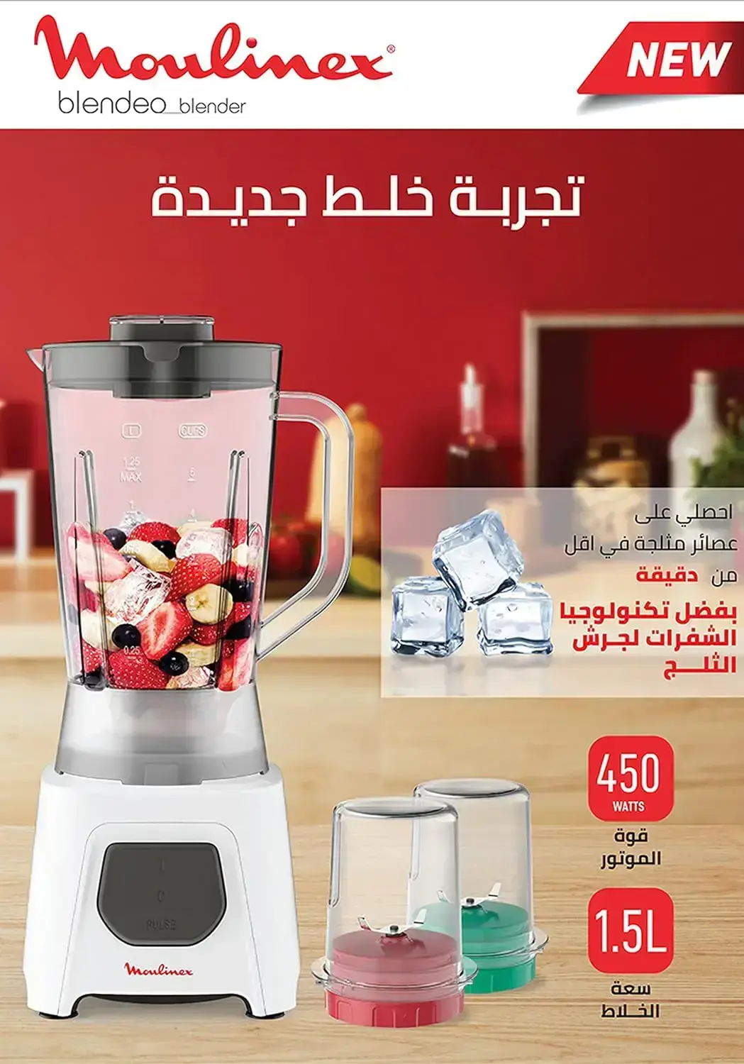 .يأتي خلاط مولينكس بلينديو مزود بشفشق كبير سعة 1.5 لتر، مما يوفر مساحة كبيرة لخلط كميات أكبر من المكونات. سواء كنت تقوم بإعداد مشروبات لذيذة لجميع أفراد الأسرة أو تقوم بإعداد مجموعة من الصلصات والاطعمة المهروسة، فإن السعة الكبيرة للشفشق تضمن لك القدرة على التعامل مع مهام الطهي المختلفة بكل سهولة وراحة.