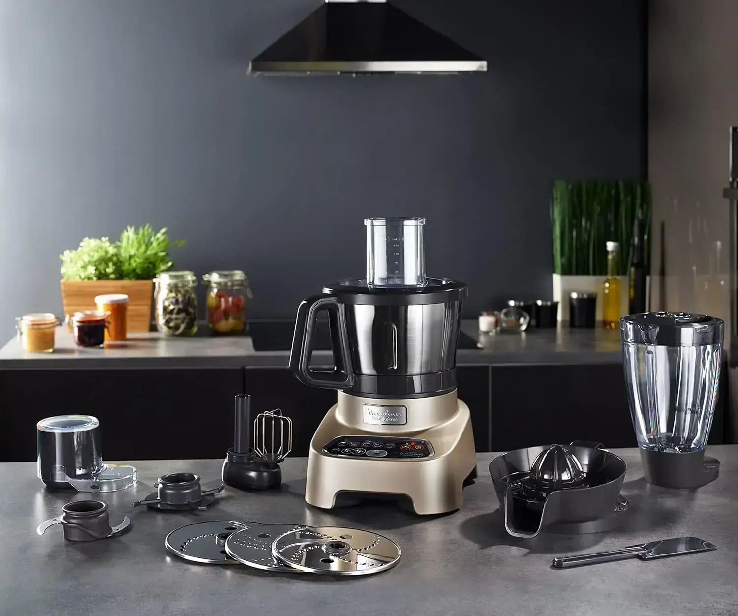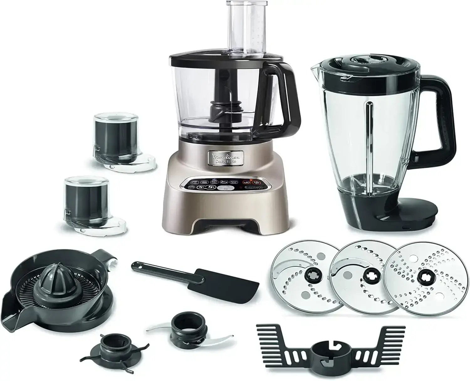 مجموعة شاملة من 11 ملحق للاستخدام المتنوع: مجهزة بمجموعة كبيرة من الأدوات المخصصة والفعالة: شفرة من الستانلس ستيل، وثلاثة أقراص قابلة للعكس من الستانلس ستيل، وبرطمان خلاط، وعجن، ومفرمة، ومطحنة وقرص لخفق الكريمة للحلويات واستحلاب الصلصات مثل المايونيز